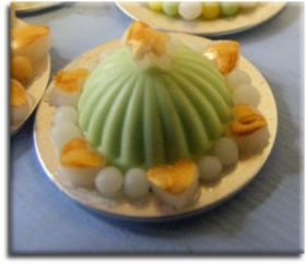 A round lime milk jelly decorated with white marchpane balls and gilded marchpane hearts and star
