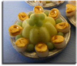 A round lemon milk jelly decorated with green marchpane balls and gilded marchpane leaves