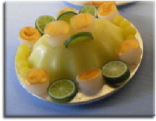An oval lemon milk jelly decorated with gilded marchpane shapes and lime slices poached in syrup.