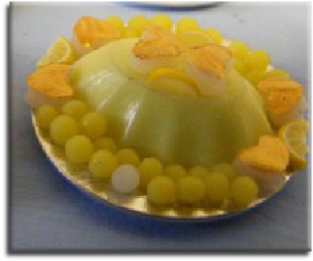 An oval lemon milk jelly decorated with yellow marchpane balls, gilded marchpane hearts and lemon slices poached in syrup