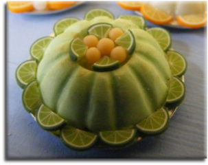 A round lime milk jelly decorated with orange marchpane balls and lime slices poached in syrup.