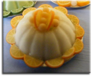 A round almond milk jelly decorated with orange marchpane balls and orange slices poached in syrup.