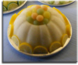 A round almond milk jelly decorated with green, yellow and orange marchpane balls and orange slices poached in syrup.