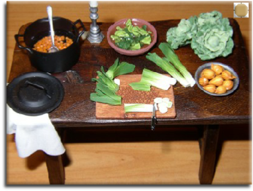 Table is made of reclaimed oak – circa 1595, the contents include:- stew pot with potage and stock, pewter candlestick holder, terracotta bowl of shredded cabbage in water, 3 cabbages, pewter bowl of onions, leeks, cloth and preparation board with peeled and sliced leeks and knife.