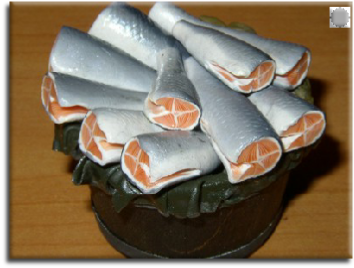 A half barrel of freshly prepared salmon, nestling on a bed of seaweed.