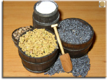 Arrangement of 4 different size barrels, containing various nuts and grains complete with grain overspill and a grain shovel.