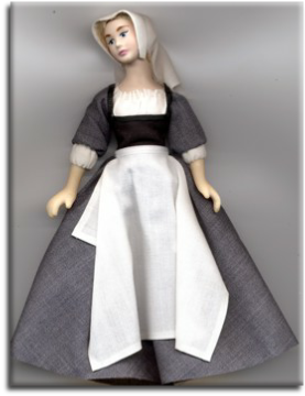 A sweet faced Tudor maid, her gently inclined head makes her ideal for posing stirring a cook pot or kneading bread. Her linen hood has the tails securely fastened up and out of the way, her white linen partlet is gently gathered around the neckline. On her feet she wears broad leather shoes so typical of Tudor footwear.