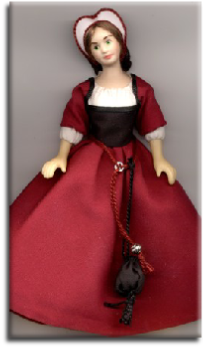 A merchants wife dressed a burgundy gown with a gently gathered white partlet. Note her sash girdle with tasselled ends and beads and also her black silk pouch