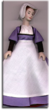 A sweet faced Tudor maid, her gently inclined head makes her ideal for posing stirring a cook pot or kneading bread. Her linen hood has the tails securely fastened up and out of the way, her white linen partlet is gently gathered around the neckline. On her feet she wears  broad leather shoes so typical of Tudor footwear.