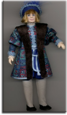 A Tudor man richly dressed in a knee length, fur trimmed, slash sleeved gown and hat.