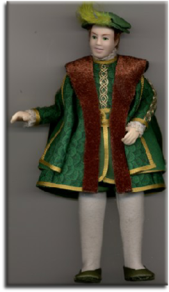 He is wearing light hose and a skirted jerkin and, of course, ruffles around his neck and cuffs.