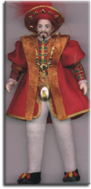 A high class Tudor gent dressed in the style of Henry VIII. Note his broad shoes, heavily jewelled hat and cod piece!