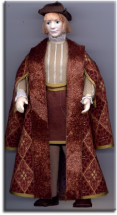 A Tudor merchant richly dressed in a long, fur trimmed, slash sleeved gown and hat.