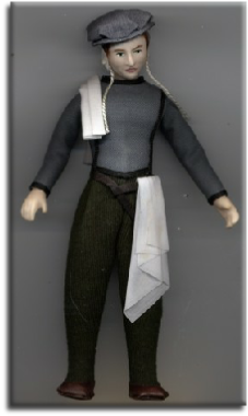 A Tudor serving man dressed simply in dark grey hose, a plain grey doublet edged in black.