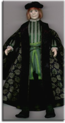 A Tudor merchant richly dressed in a long, fur trimmed, slash sleeved gown and hat.